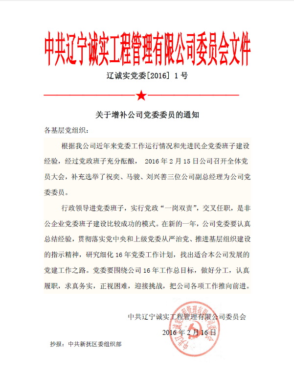 中共开云手机官方网站入口,万象城(中国)委员会文件——关于增补公司党委委员的通知