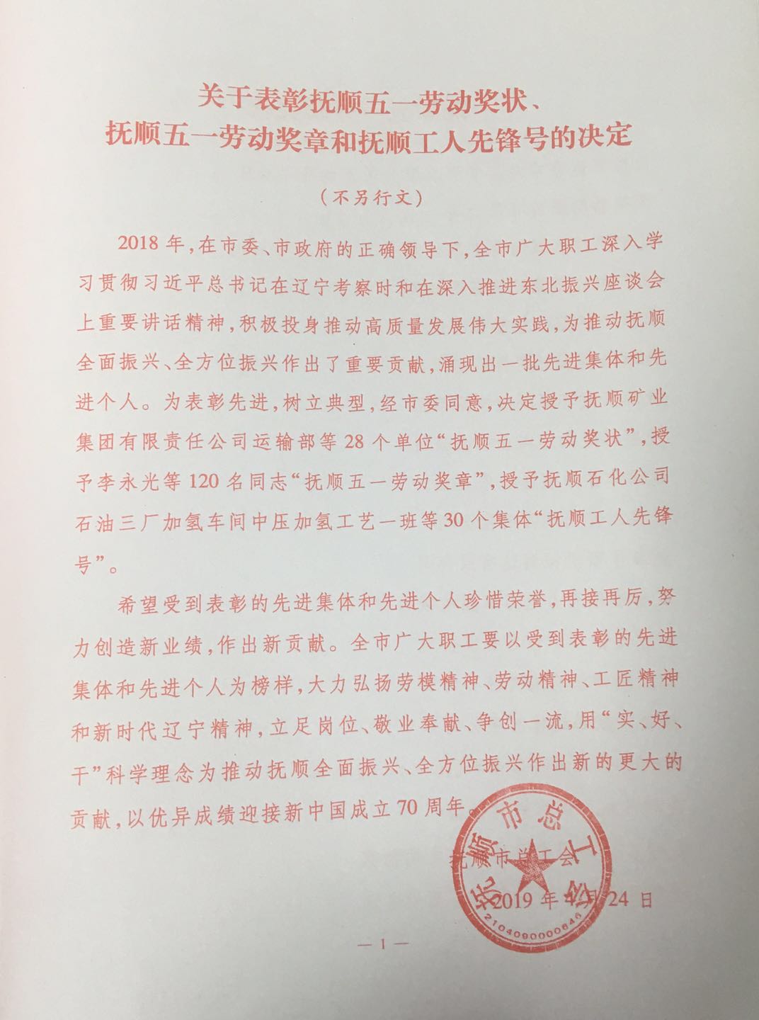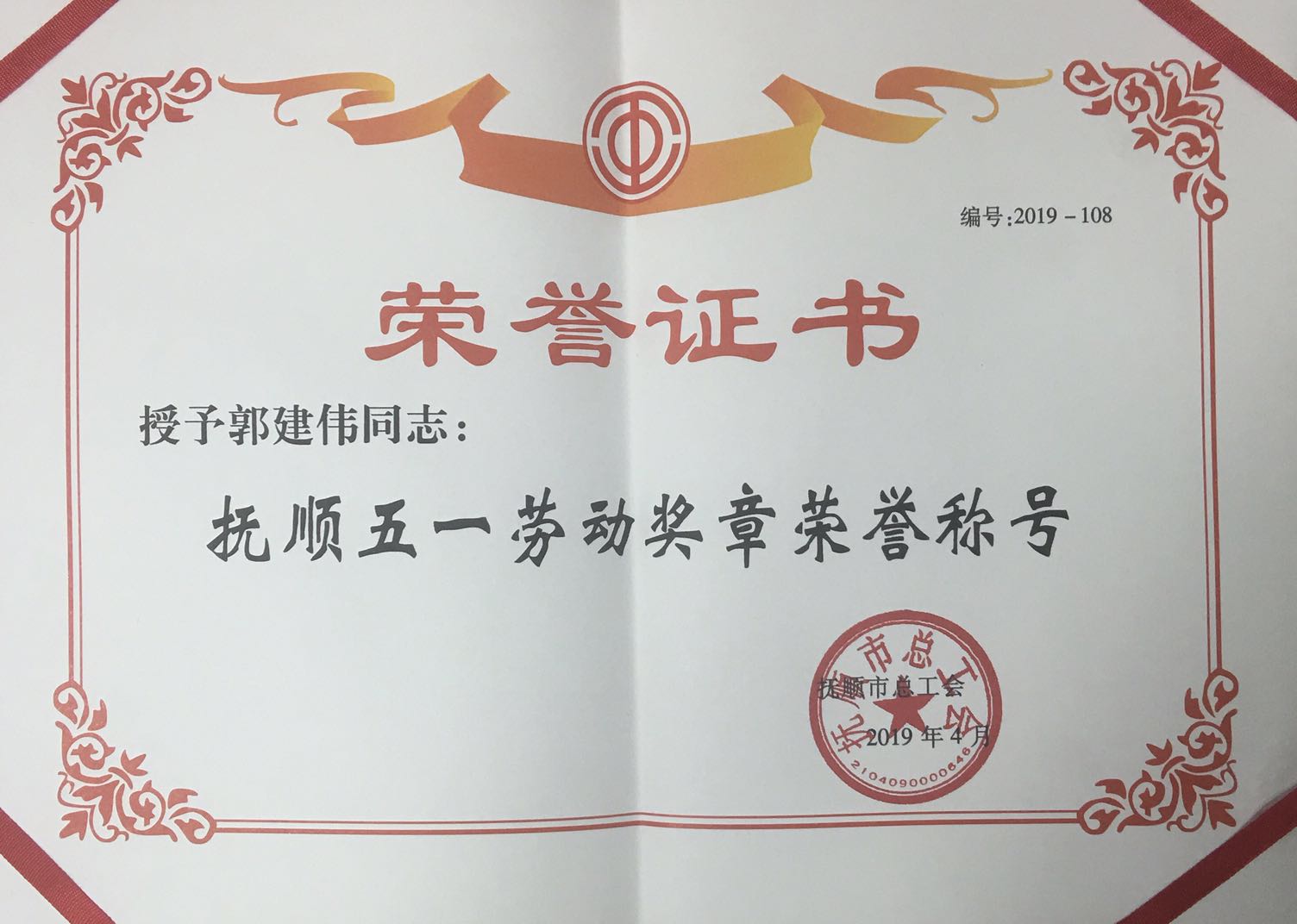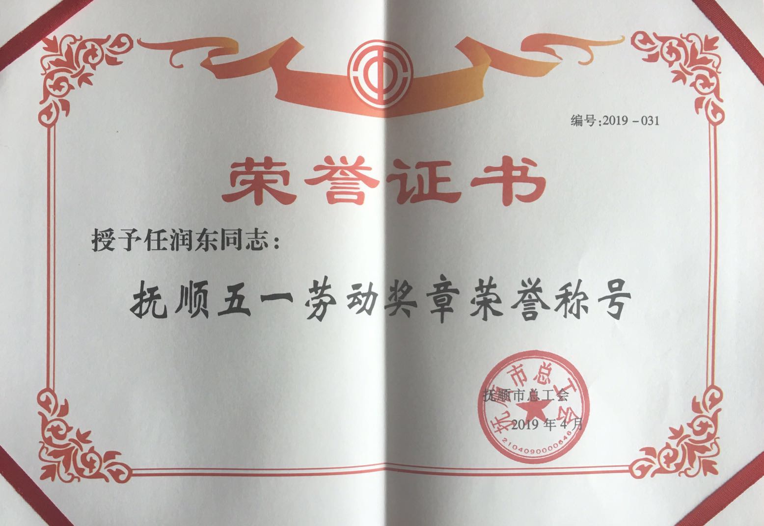 热烈庆祝我单位任润东、郭建伟两位同志荣获“抚顺五一劳动奖章”荣誉称号