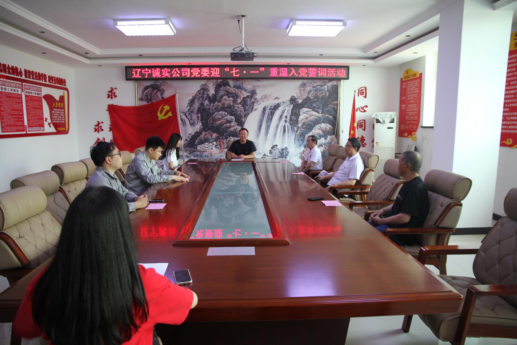 党员们在公司一楼的党建活动基地面对着党旗重温入党誓词,重忆入党初心,牢记宗旨,锤炼党性,坚定信念,在铮铮誓言中再燃奋斗激情。