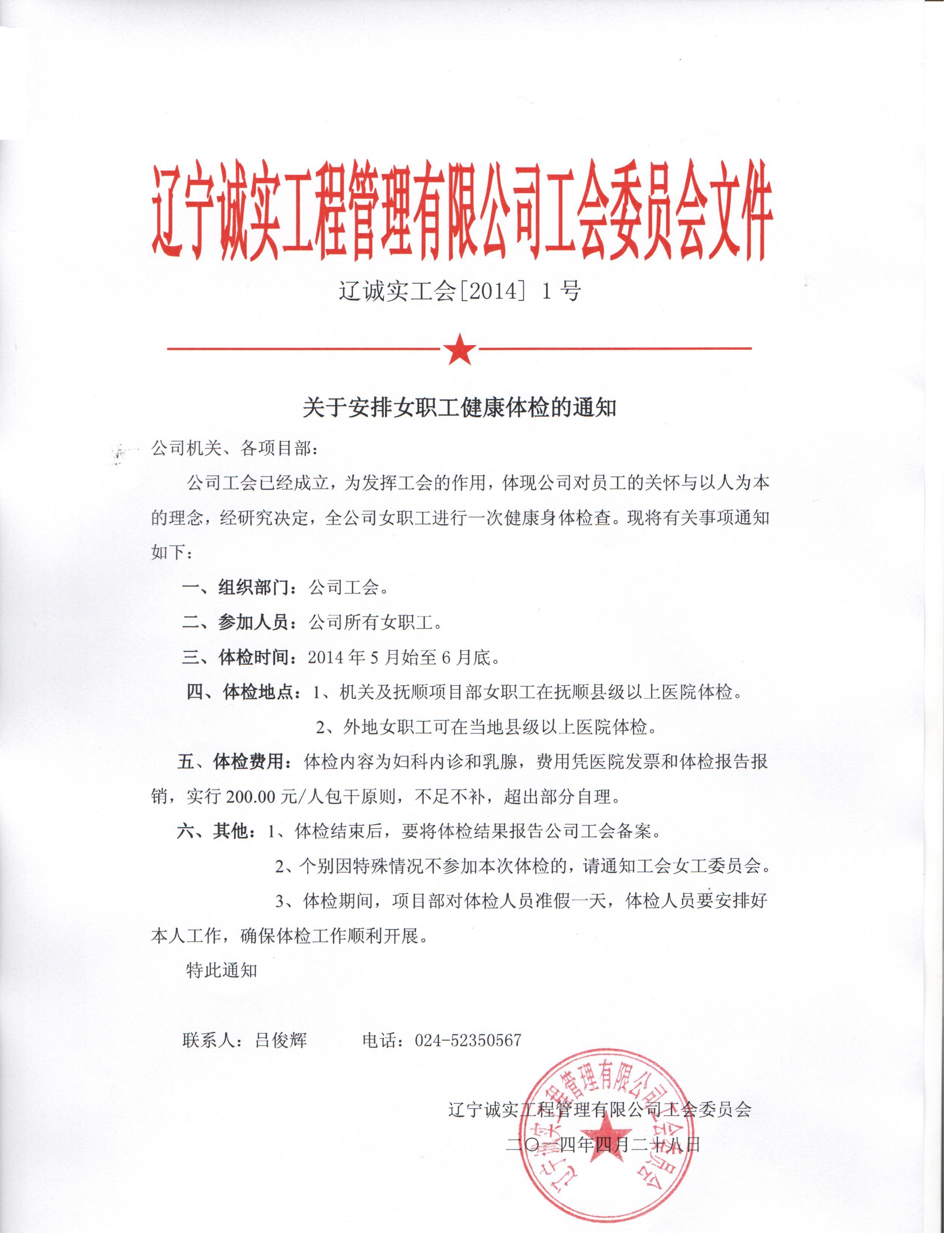 诚实工会将组织全体女职工于2014年5月底至6月底期间进行健康体检
