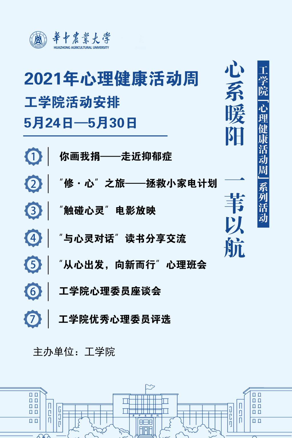 5月25日是全国大学生心理健康日。为引导同学们认识关爱自身心理健康的重要性,培养自尊自信、理性平和的健康心态,形成乐观向上的精神风貌,学校与学院开展了以“心系暖阳,一苇以航”为主题的第十九届心理健康活动周。