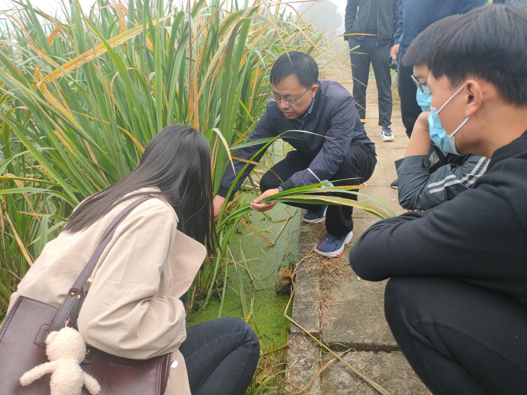 随后,一行人实地考察了茭白、芡实、莼菜、菱角、莲藕和芋头等水生蔬菜,深入了解了上述蔬菜外观形状、生长环境收获方式和目前科研难点等内容。张国忠教授就品种、种植现状、以及各类水生蔬菜生产机械化存在的困难向大家进行了讲解。着重对莲藕、茭白等水生蔬菜的机械化收获向研究生们提供思路,启发同学们深入思考。当看到池塘里巨大的莲藕时,张国忠教授转向同学们说道:“经过我们多年的科学研究发现,莲藕机械收获时因作业幅宽较小,导致部分莲藕周边淤泥不能被全部清除,仍有部分藕节被淤泥包裹,但作业幅宽增大后又会带来行进效率降低、冲刷水量不足等限制,这是我们课题组当前亟待解决的问题。”