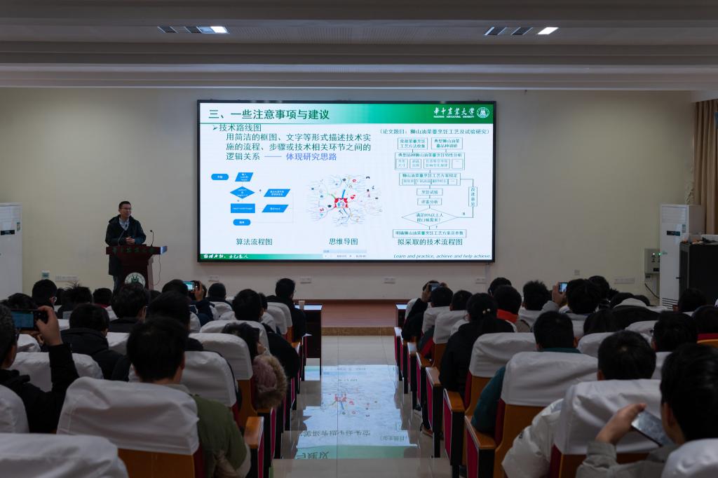 1月9日上午,由jdb电子游戏官方网站油菜机械化生产技术与装备团队主办的精工讲坛在工程楼A111进行。黄小毛教授和何平教授与近200名师生一起交流研究生过程性文档的写法经验和科技论文写作规范和经验。团队负责人廖庆喜教授主持讲坛。