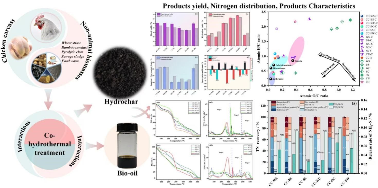 To determine the feasibility of co-hydrothermal treatment to achieve cleaner production of chicken carcass (CC), we selected six non-animal biomasses (wheat straw (WS), bamboo sawdust (BS), wheat straw-derived pyrolytic char (WC), bamboo sawdust-derived pyrolytic char (BC), sewage sludge (SS), and food waste (FW)) for co-hydrothermal treatment with CC. The results showed that CC and FW yielded the greatest synergistic effect on bio-oil production with a synergistic coefficient of 25.20%, while co-hydrothermal treatment of CC and WS resulted in the maximum yield of bio-oil (51.25%). CC and BC achieved the greatest synergistic effect on hydrochar formation, with a maximum yield of 54.16 wt%. Moreover, the interaction between CC and all other biomasses reduced the release rate of ammonia in gas products, wherein the interaction between BS and CC promoted nitrogen immobilization in hydrochar with a maximum synergistic coefficient of 395.53%. The co-hydrothermal treatment enhanced the deoxygenation reaction, resulting in hydrochars with lower oxygen-carbon ratios and higher heating value. The co-hydrothermal treatment also could facilitate the preparation of uniform and regular carbon microspheres, increase the specific surface area and enhance the adsorption capacity of copper ions of hydrochar, elevate the ignition point temperature of hydrochar to reduce the risk of fire during transport and storage, and expand the combustion temperature range of hydrochar. Additionally, the bio-oil obtained from co-hydrothermal treatment of CC and FW exhibited the best combustion performance with the highest comprehensive combustion index of 7.24 ℃-3·min-2.