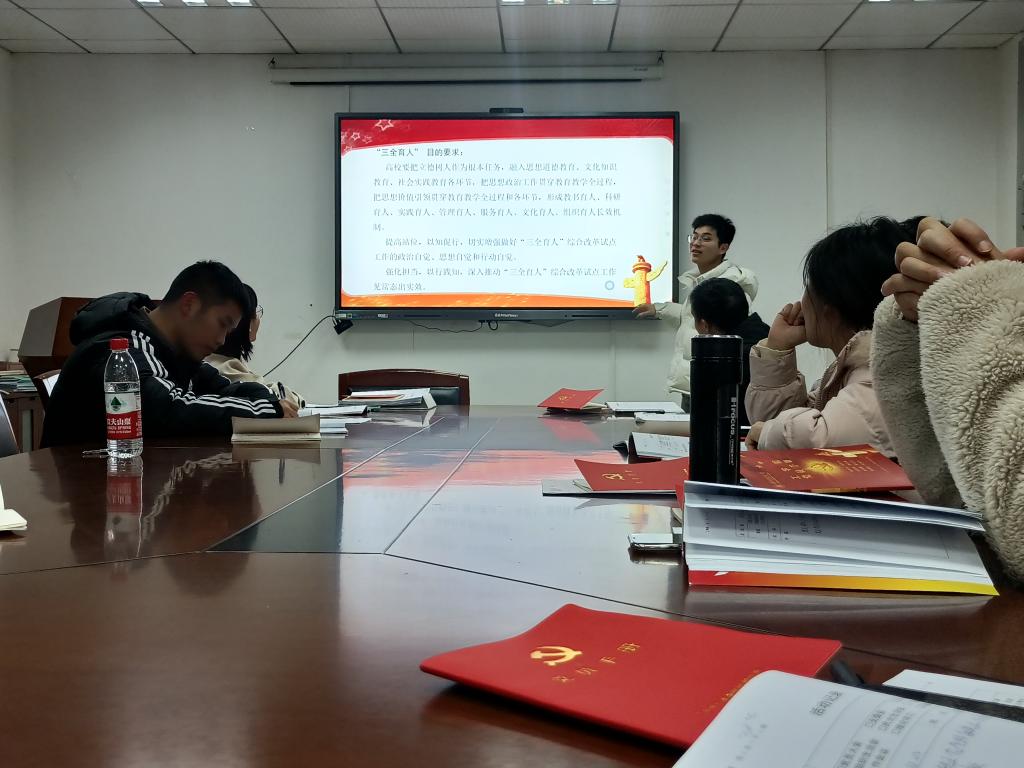 王岩同志在领学《加强和改进“三全育人”工作实施意见》时提到“三全育人”即全员育人、全程育人、全方位育人。他特别分享到jdb电子游戏官网召开的12月基层党组织书记例会暨“三全育人”工作推进会的四点要求:一是要落实主责,务实重行;二是要深学真信、力行见效;三是要三全育人、守正创新;四是要全面盘点、系统谋划。