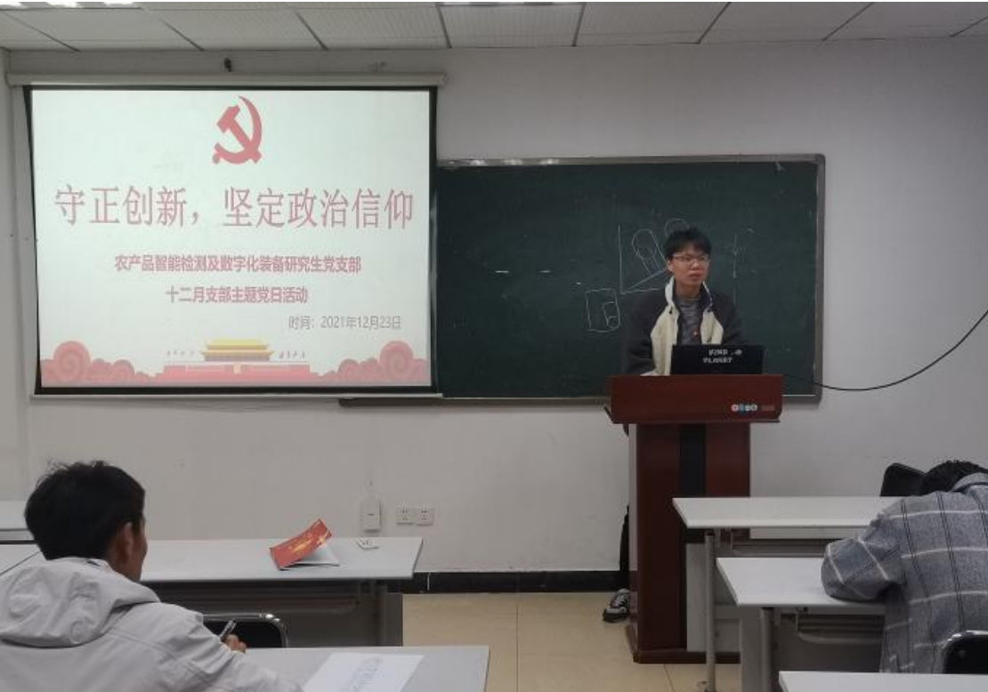 2021年12月23日,为进一步学习贯彻十九届六中全会精神,加强研究生党员思想建设,坚定政治信仰,jdb电子游戏官方网站农产品智能检测及数字化装备研究生党支部在工程楼B620会议室开展以“守正创新,坚定政治信仰”为主题的党日活动。