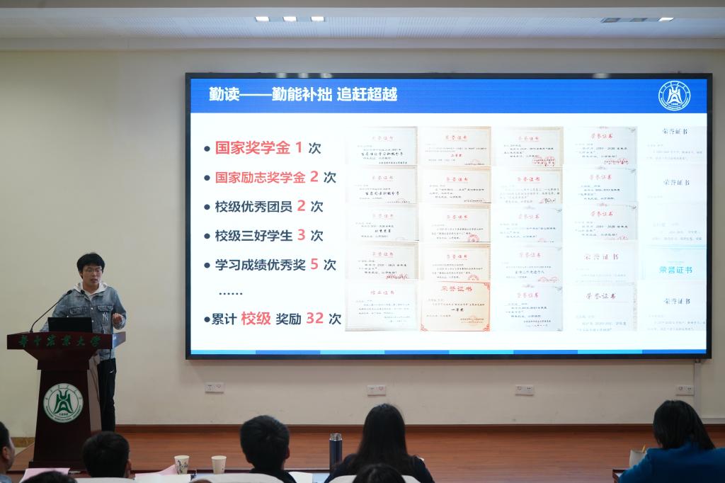 投票环节,邀请到2021年jdb电子游戏官方网站大学生标兵获得者能动1801班张子航为大家分享他的学习经验,从当“大学生标兵”观众到真正成为“大学生标兵”获得者,他用实际行动实现了自己的目标。学习方面,他善于规划、总结反思、笃志好学;科研方面,熟能生巧,巧能生精;实践方面,躬行实践,乐于奉献。“因为我的大学,成就了现在的我,他教会我要做一个,立大志、明大德、成大才、担大任的华农人!”青衿之志,履践致远;云程发轫,万里可期!这是张子航给大家的寄语,希望大家能有一个无悔的大学时光。