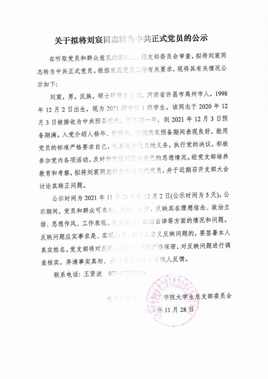 【研】关于拟将刘宸同志转为中共正式党员的公示