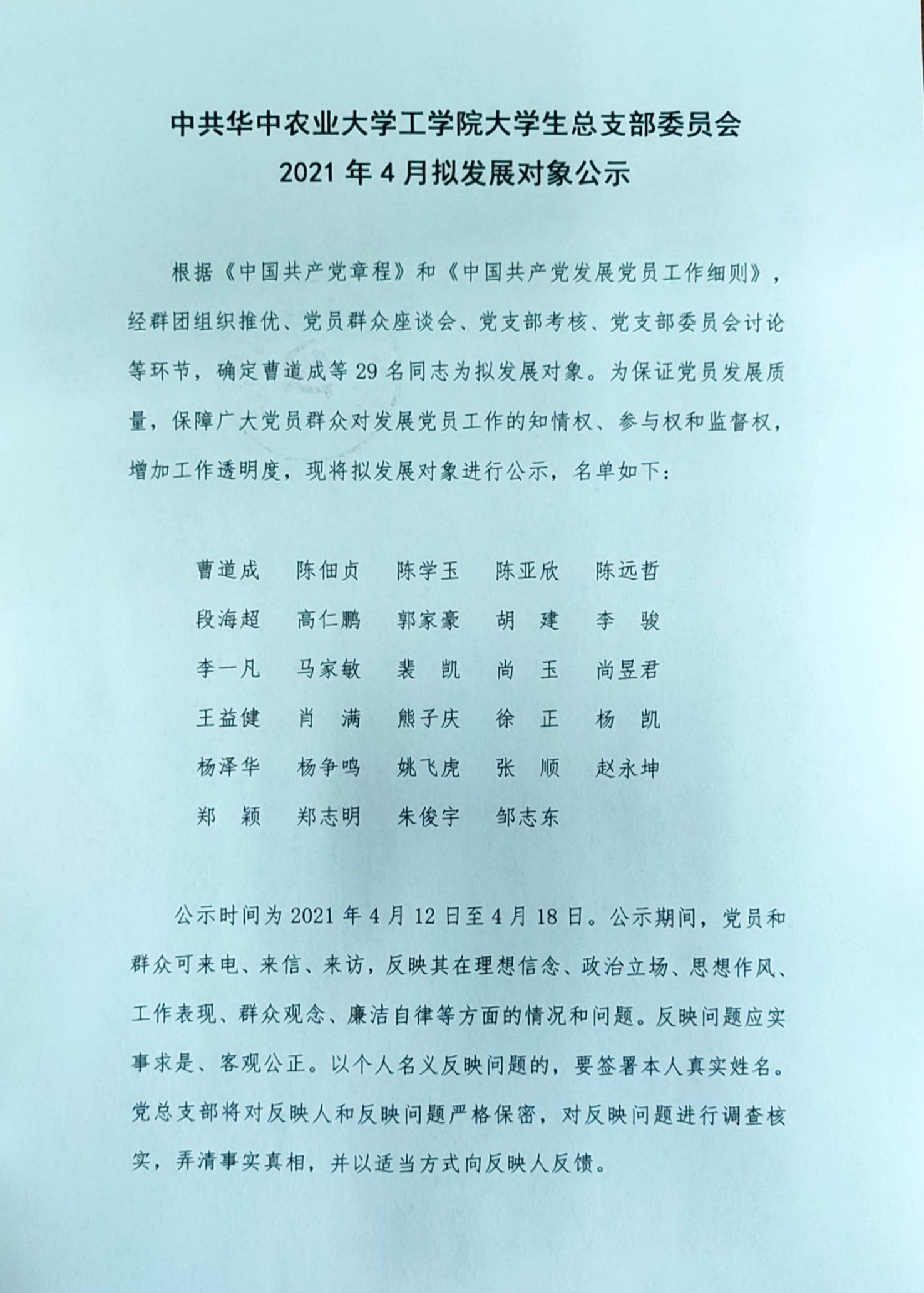 中共jdb电子游戏官方网站大学生总支部委员会2021年4月(上半年第一批)拟发展对象公示