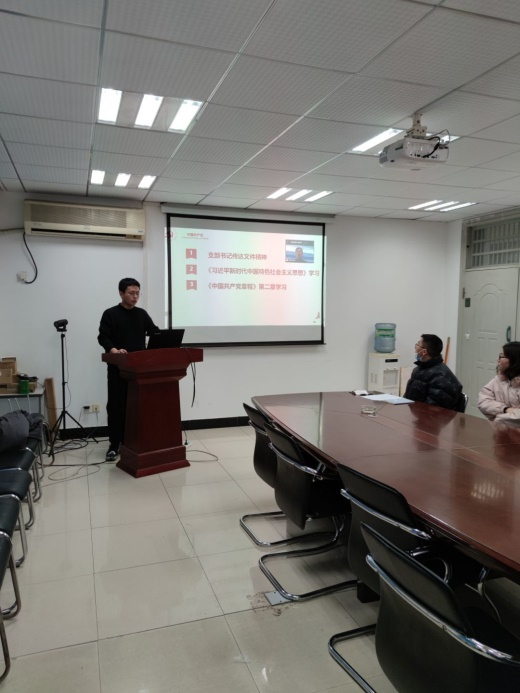 活动开始,张胜同志带领全体成员重温入党誓词,旨在让大家时刻谨记入党时的信念与决心,牢记作为一名党员的职责与义务。紧接着,党支部书记冷俊松传达《关于召开2020年度组组织生活会和开展民主评议党员的通知》文件精神,指出要扎实做好组织生活会会前准备工作、做好民主评议党员的有关准备工作。支部组织委员鄢钱带领全体成员学习《习近平总书记2021新年贺词》,并对文中的一些金句如“平凡铸就伟大,英雄来自人民”等做了分享和解读。赵世达同志领学了《习近平在省部级主要领导干部学习贯彻党的十九届五中全会精神专题研讨班开班式上发表的重要讲话》,他指出,我们党员要立足当前、着眼长远,增强工作的积极性、主动性和创造性。