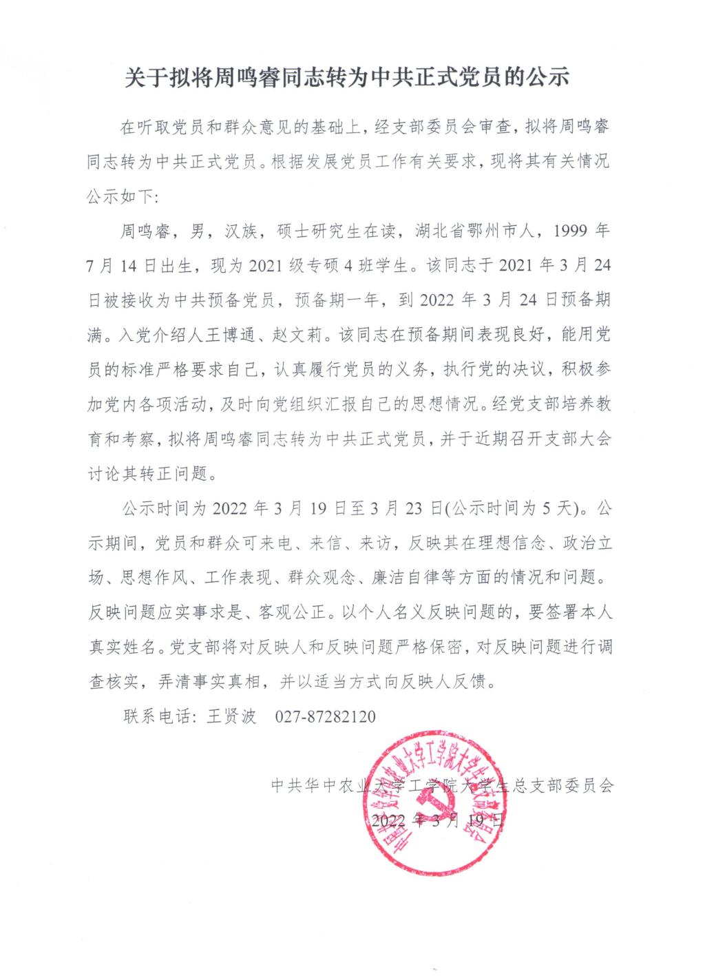 【研】关于拟将周鸣睿同志转为中共正式党员的公示