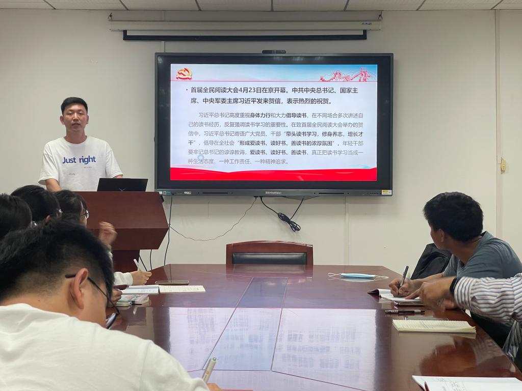 会议开始,贾槟源同志带领支部全体党员重温入党誓词。刘风顺同志在领学《习近平总书记致首届全民阅读大会举办的贺信》时谈到,书籍是人类知识的总结,书籍是全世界的营养品,我们要养成爱读书、读好书、善读书的良好习惯。当我们第一遍读一本好书的时候,我们仿佛找到了一个朋友;当我们再一次读这本书的时候,仿佛又和老朋友重逢。作为新时代的党员,我们应该把读书学习当成一种生活态度、一种精神追求。