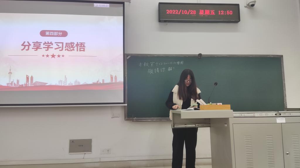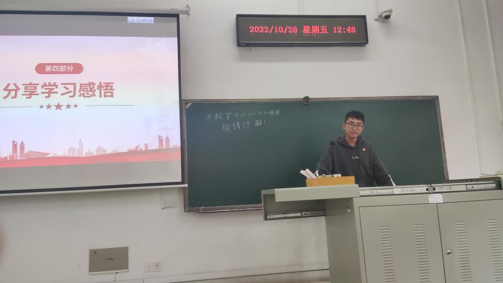 会议伊始,郭俊豪同志带领大家宣誓入党誓词,随后由张景明同志带领大家学习党代会的相关知识。他指出,中国共产党全国代表大会和它所产生的中央委员会为中国共产党最高领导机关。根据党章,中国共产党全国代表大会每5年举行一次,由中央委员会召集。随后他对党的二十大召开的重要历史意义谈了自己的想法,他谈到,党的二十大回顾总结了过去五年的工作和新时代十年的伟大变革,是在全党全国各族人民迈上全面建设社会主义现代化国家新征程、向第二个百年奋斗目标进军的关键时刻召开的一次十分重要的大会,是一次高举旗帜、凝聚力量、团结奋进的大会。