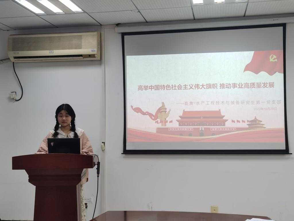 畜禽水产工程技术与装备研究生第一党支部召开主题党日活动集中学习二十大精神。齐悦颖同志谈到,要坚定围绕在以习近平同志为核心的党中央周围,全面贯彻习近平新时代中国特色社会主义思想,充分发挥好先锋模范的作用,团结带领同学们刻苦学习,努力钻研,为实现第二个百年奋斗目标做出自己的贡献