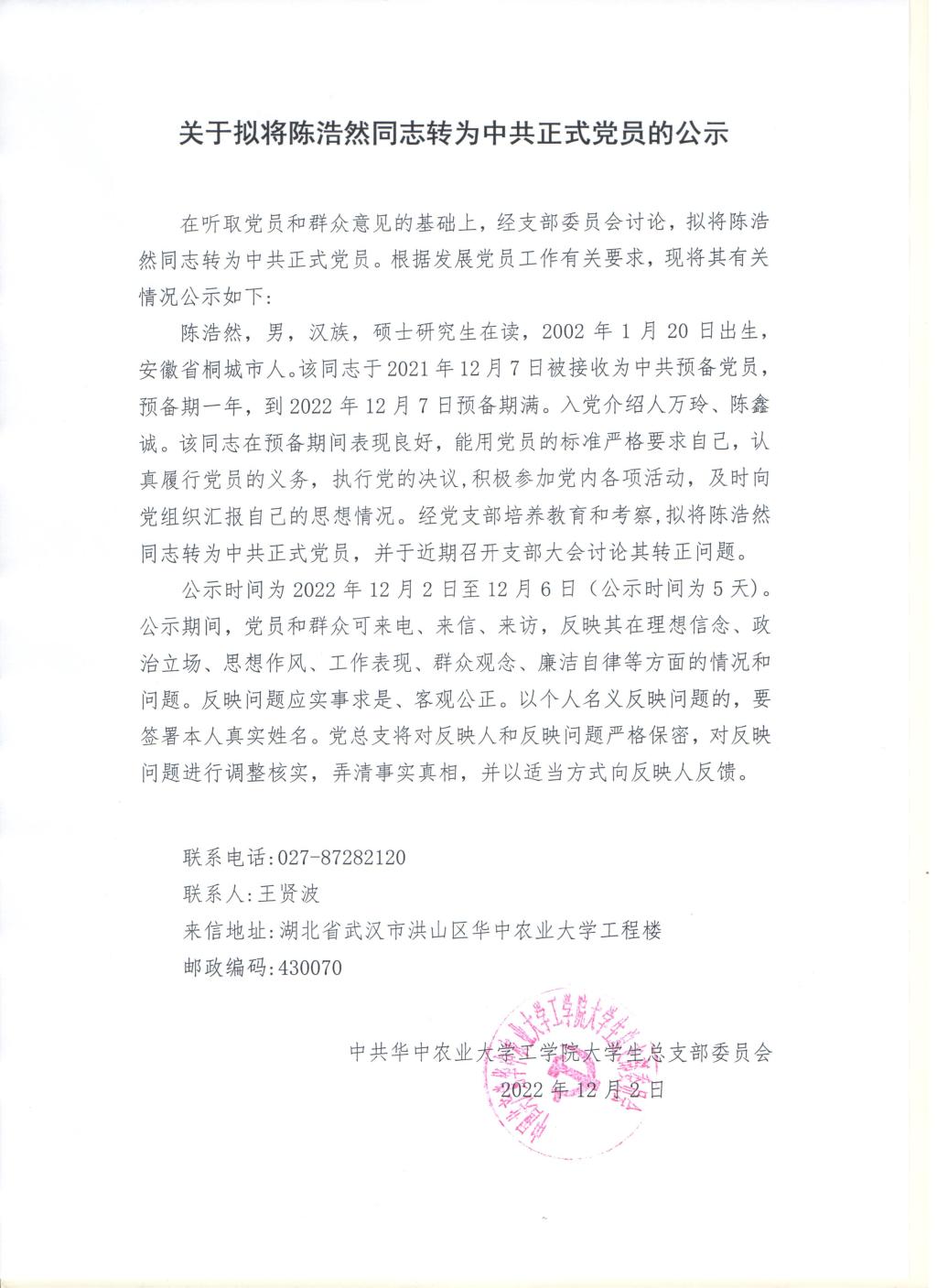 【研】关于拟将陈浩然同志转为中共正式党员的公示
