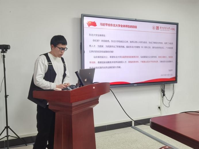 付瑞诚同志领学习近平总书记给东北大学全体师生的回信。他谈到我国教育事业的发展必将为中国式现代化作出更大贡献,坚持用习近平新时代中国特色社会主义思想启智润心、凝心聚力,我们的教育事业必将蒸蒸日上、更加光明。身为党员,更应该迎难而上、钻研创新,将自己的所学所能贡献到祖国需要的地方。