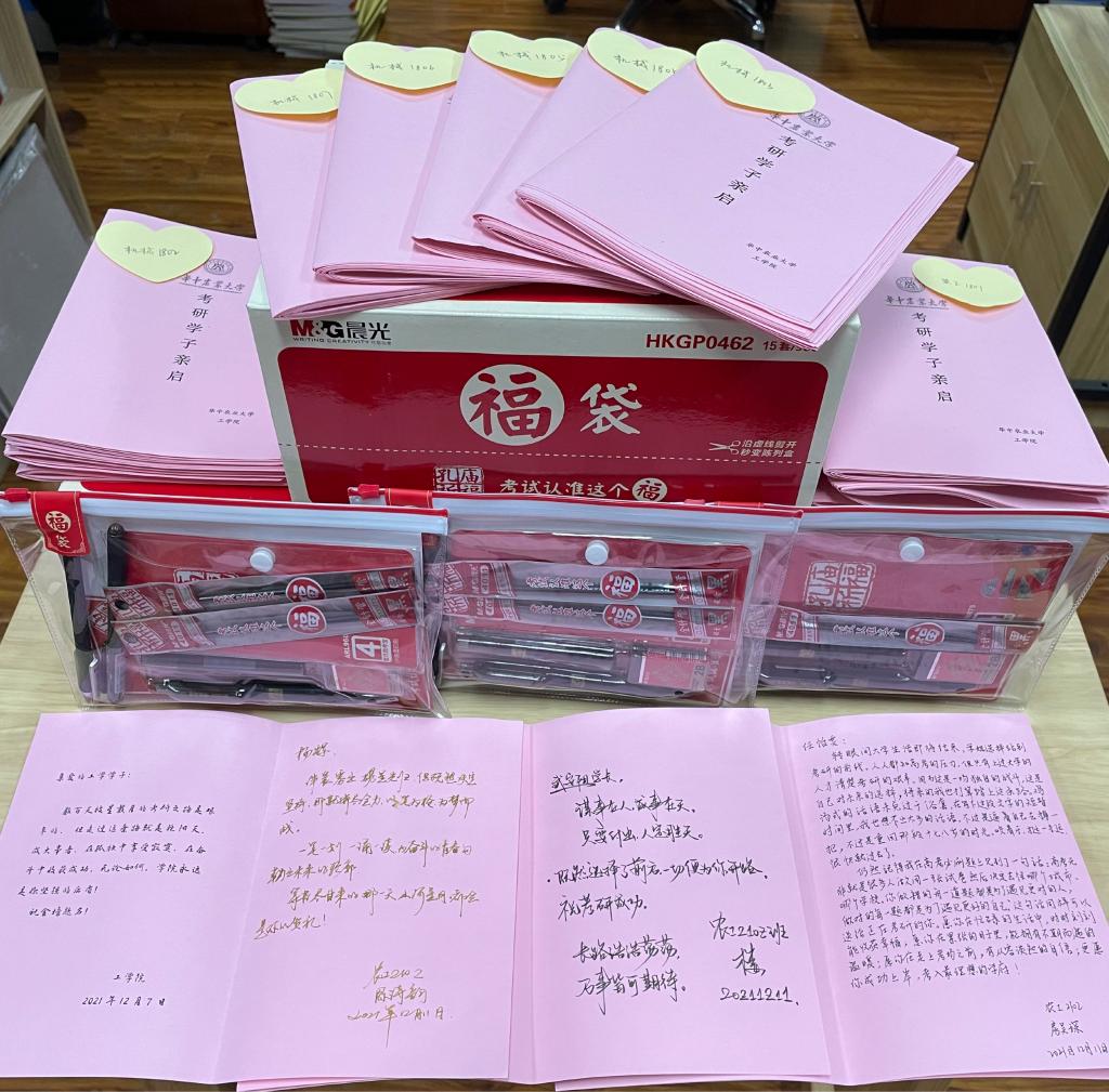 “考研加油包”由文具福袋和新生们亲手书写的祝福卡片组成。“你要相信正在努力的你,所向往的前方一定会到达,你所坚信的都会有收获。”“要好好爱护自己的身体,吃好喝好,以积极平和的状态去应对这场属于你的战役!”“生活不会辜负披星戴月的你,准备的日子里,孤独是你的代名词,夜以继日、勤耕苦读,成功永远掌握在有准备的人手中。”300余名新生用手中的笔传递着对师兄师姐最美好的祝福。学院领导与班主任也为学子们送去美好祝愿,院长廖庆喜寄语全院考研学子:“坚定本心,发扬执着专注、一丝不苟、追求卓越的工匠精神,付出必有收获,相信你一定能成功!”