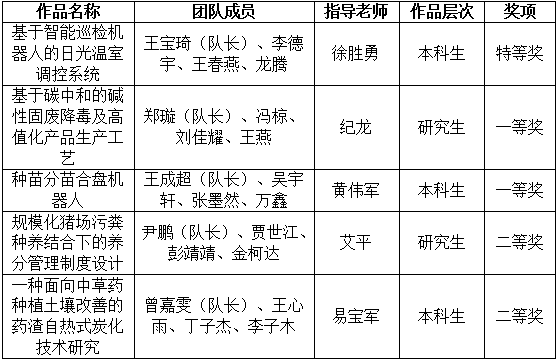 其中,由jdb电子游戏官方网站徐胜勇老师指导,王宝琦、李德宇等同学参赛的创新类指定项目《基于智能巡检机器人的日光温室调控系统》获特等奖;由纪龙老师指导,郑璇、冯椋等同学参赛的创新类自选项目《基于碳中和的碱性固废降毒及高值化产品生产工艺》,及由黄伟军老师指导,王成超、吴宇轩等同学参赛的创新类指定项目《种苗分苗合盘机器人》分获一等奖;由艾平老师指导,尹鹏、贾世江等同学参赛的创新类指定项目《规模化猪场污粪种养结合下的养分管理制度设计》,及由易宝军老师指导,曾嘉雯、王心雨等同学参赛的创新类自选项目《一种面向中草药种植土壤改善的药渣自热式炭化技术研究》分获二等奖。