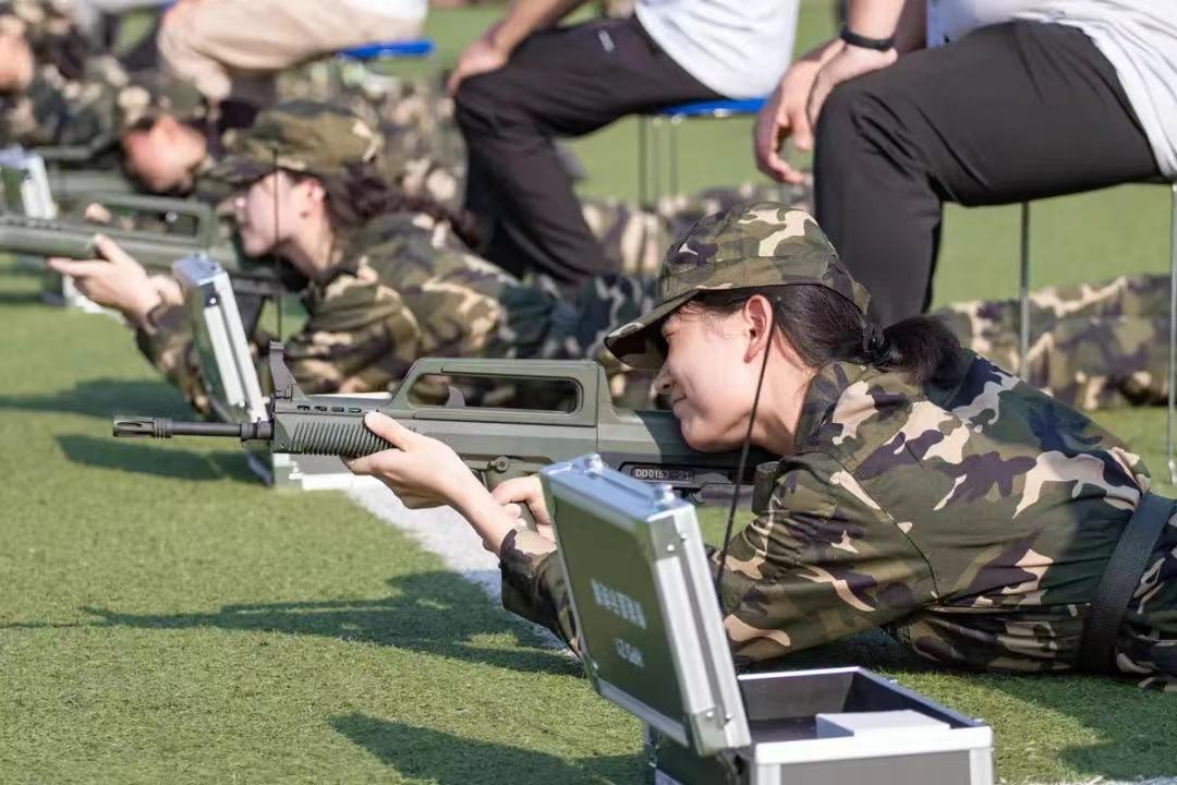 “卧倒!”随着教官一声喝令,军训学员们整齐趴下,持枪、瞄准、射击,所有动作行云流水,一气呵成。他们姿势标准、目光坚毅、神情专注、一击即中。听着电子设备播报的射击成绩,同学们露出了灿烂的笑容,意犹未尽的他们甚至想要再次走上靶场,向满环发起冲击。虽然是模拟射击训练,但比真正的95式还重的模拟枪支和子弹激发时产生的后坐力仍然让同学们感受到了射击的真实感和刺激感。