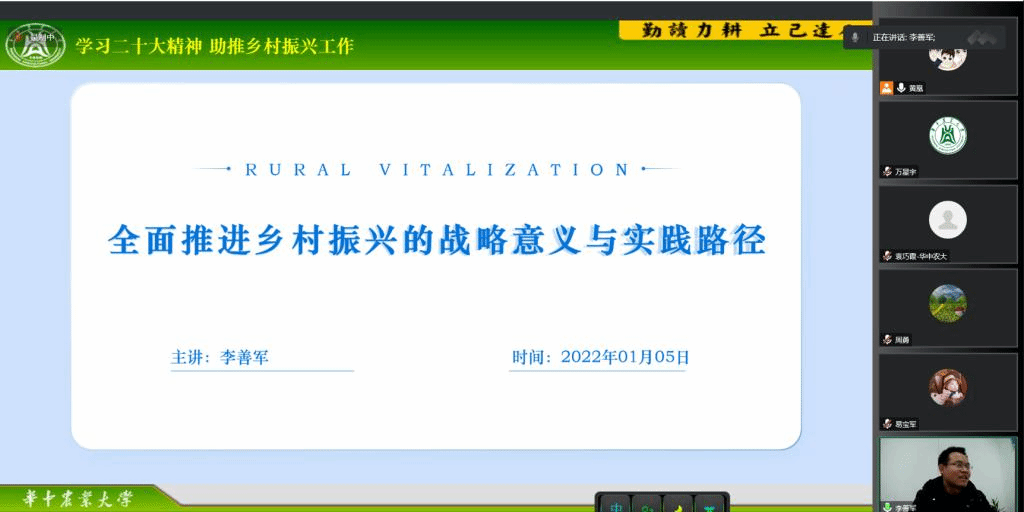 jdb电子游戏官方网站副院长李善军以“全面推进乡村振兴的战略意义与实践路径”为题进行了主题宣讲。他从我国“三农”发展情况、历年中央一号文件、《关于做好2022年全面推进乡村振兴重点工作的意见》、二十大报告等内容阐述了乡村振兴战略的提出背景及其重要意义。在讲述实施乡村振兴战略的总体要求时,乡村振兴要做到产业兴旺、生态宜居、乡风文明、治理有效、生活富裕,他强调“乡村振兴不是单打一,而是统筹谋划农村经济建设、政治建设、文化建设、社会建设、生态文明建设和党的建设,使乡村各方面建设全面推进、协调发展”。他从“坚持党管‘三农’原则,强化乡村振兴组织保障”“巩固脱贫攻坚成果有效衔接乡村振兴”“坚持绿色发展理念,建设生态宜居新家园”“以富裕农民为目标,培育乡村发展新动能”等四个方面讲述了湖北省三农问题现状及乡村振兴路径选择。最后,李善军强调:乡村振兴是一个历史课题,不是“轻轻松松,敲锣打鼓”就能实现的,必须拿出“功成不必在我”的精神境界和“功成必定有我”的历史担当,不驰于空想、不骛于虚声,驰而不息,久久为功,为乡村振兴做出应有贡献。