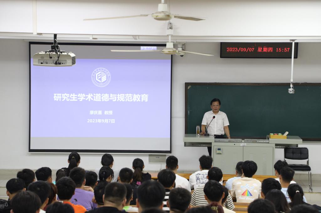 院长廖庆喜教授向全体新生详细介绍了学校和学院的基本情况以及发展现状,随后为新生讲授“学术道德与规范教育”新学期第一堂课。他从诚信的起源发展、学术不端行为内涵、学术规范相关文件、学术不端案例分析、防范对策及注意事项等五个方面阐述了讲诚信和遵守学术规范对于科学道德和学风建设的重要意义。他强调,研究生要做学术道德规范的主动践行者,主动加强学术道德规范学习,切实提高自身学术水平,强化科研基础能力训练。
