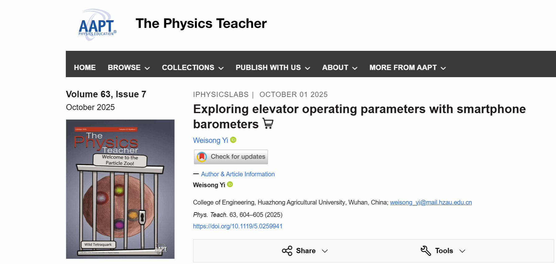 近日,jdb电子游戏官网大学物理教学团队在《The Physics Teacher》发表了题为“Exploring elevator operating parameters with smartphone barometers”(Weisong Yi, 2025, Phys. Teach. 63, 604–605.)的物理实验教学研究论文。《The Physics Teacher》是由美国物理教师协会(The American Association of Physics Teachers,简称AAPT)主办的国际知名物理教育教学类期刊,为物理教育研究领域唯一的SCI收录期刊,具有非常高的学术影响力。