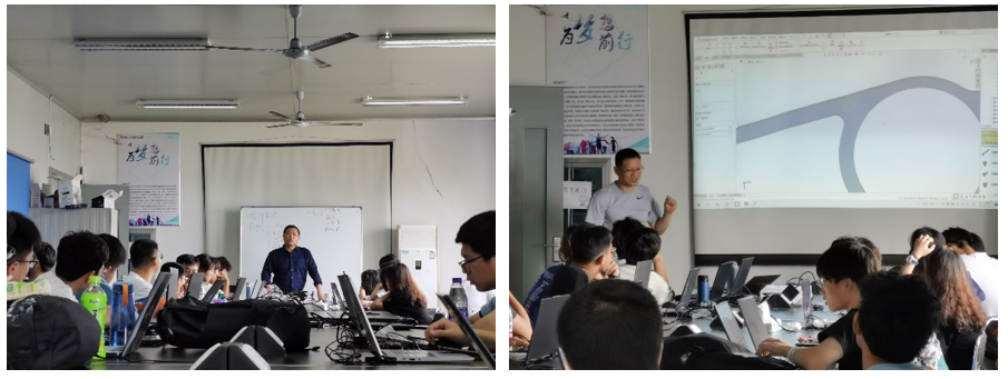 左:赵纯清老师讲解二维零件表达; 右:潘海兵老师讲解三维建模