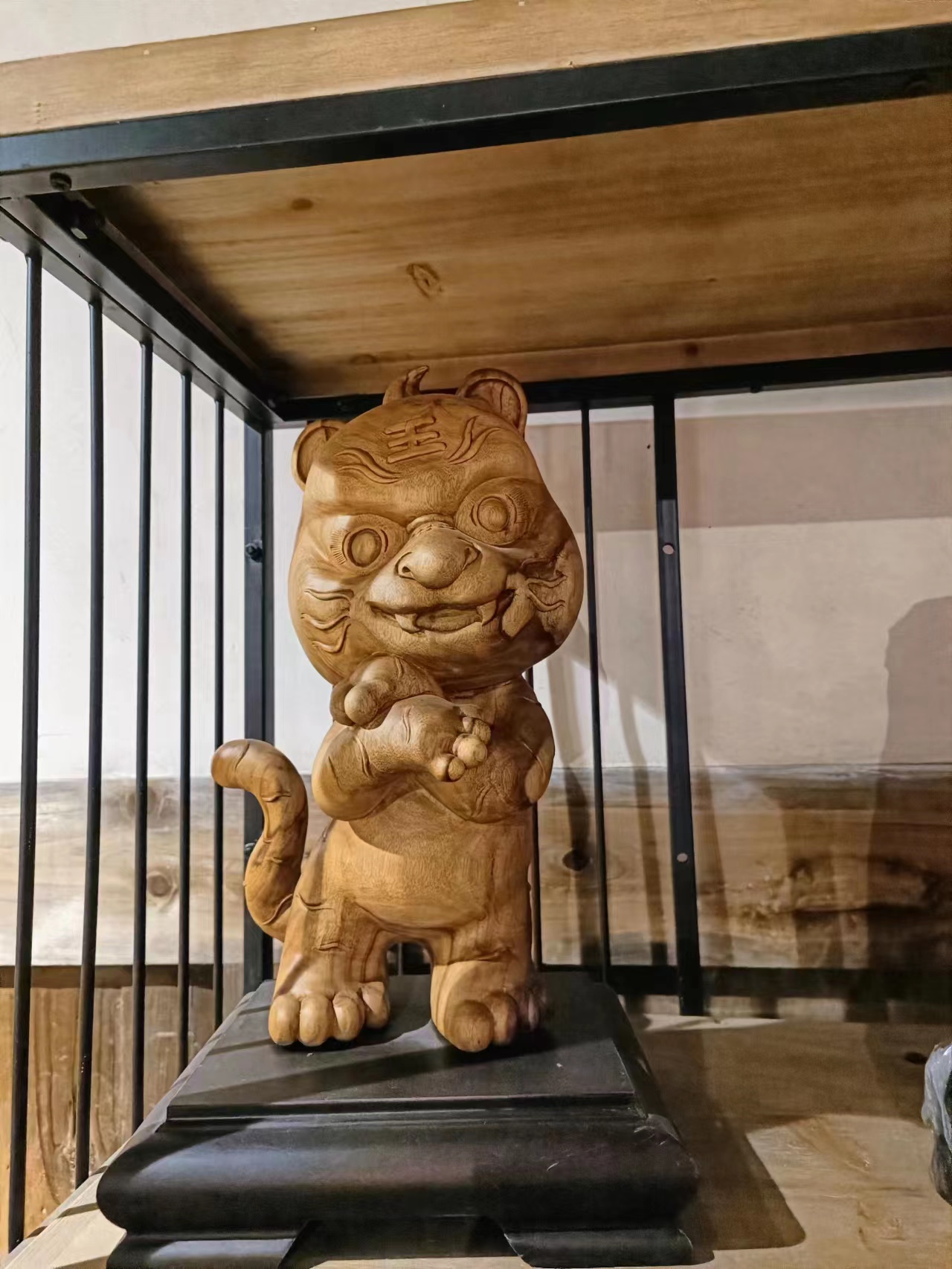 经过与金宁魁先生的交流,成员们了解到,现在的闽侯根雕一是延续传统制作技艺与审美志趣,制作以借料型而为之的仙人、灵兽等形象;另一方面,为了迎合时下的市场需求,也设计制作符合年轻人审美的卡通木雕作品、整板木料的茶桌板桌等实用类器物,以此广开销路。同时,他的工作室也通过“互联网+木根雕”的新兴方式来拓宽销售渠道,宣传推广根雕艺术,让根雕作品走出去。“根雕要表现得再当代一些,应该有当代的精神在里头,让年轻人也看懂并喜爱上传统技艺。”所以金宁魁先生也常将根雕以现代形象的形式雕刻,如《招财猫》、《航空母舰》,《小脑斧》等。